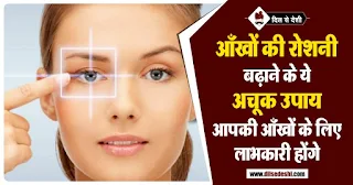आजकल कई लोग आँखों की रोशनी कम होने की वजह से परेशान रहते है। आँखों के कमजोर होने पर सिर दर्द की समस्या बनी रहती है। आँखों की रोशनी कम होने के कारण जैसे - हमारा रहन सहन, अधिक टी.वी देखना, मोबाइल कंप्यूटर का अधिक प्रयोग, पौष्टिक खाना ना खाना या किसी बीमारी की वजह से आँखों की रोशनी कम हो जाती है।